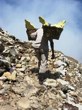 SchwefelDer Berg Blutet Feuerrot Und heiß Flüssiger Schwefel Quillt hervor Kühlt ab Vergilbt Riecht Ätzend Herkunft Dem Teufel Zugeschrieben Der arme Teufel | ![]() | LastenschlepperSchwefelbrocken In Körben Über der Schulter Aufwärts schleppen Abwärts schleppen Tagtäglich Jung, kräftig Älter, ausgemergelt Wie lange noch Und deine Körbe werden Frei |